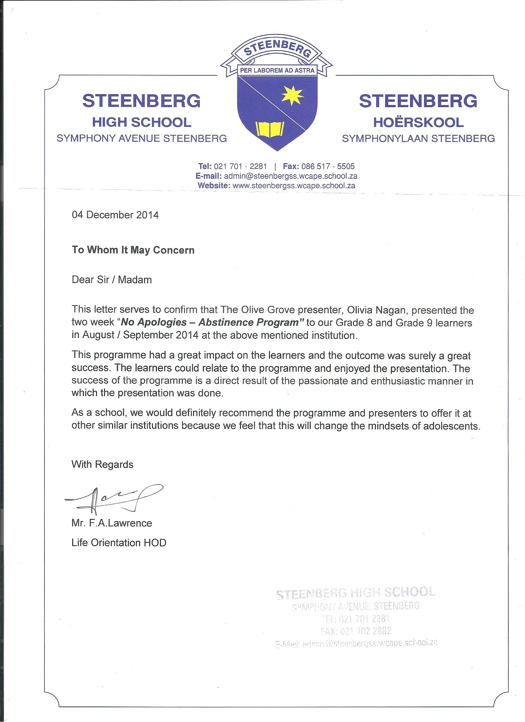 The Olive Grove is a registered NPO (087-909-NPO) based in Cape Town, and is led by Strategic Programmes Director Olivia Nagan, a qualified Psychological Counsellor. Involved in counselling youth as well as ‘families at risk’ from areas including Grassy Park, Retreat, Steenberg, Lavender Hill, Cafda, Seawinds, for the past 30 years, Olivia is also an accredited Focus on the Family facilitator and serves on the Board of Stop Trafficking Of People (STOP). Partnering with local community organisations, schools and social development initiatives, The Olive Grove has entrenched its footprint across the impoverished communities of the Western Cape. From community feeding programmes, to holiday camps and activities. The Olive Grove has reached some 30, 000 school learners with a relatively small team of volunteer facilitators – an incredible feat! The programmes offered by The Olive Grove include the ‘No Apologies’, Anti-Bullying and Traffic Proof. Since opening its doors in 2011, this fire-starter has been both a catalyst and partner for meaningful social change and relies solely on the financial support of individuals and corporate's. If you would like to invite The Olive Grove to your school or community group or if you would like to get involved, CALL or EMAIL us: theolivegrove01@gmail.com or olivianagan@gmail.com Cell: +27 (0)82 2934 946.